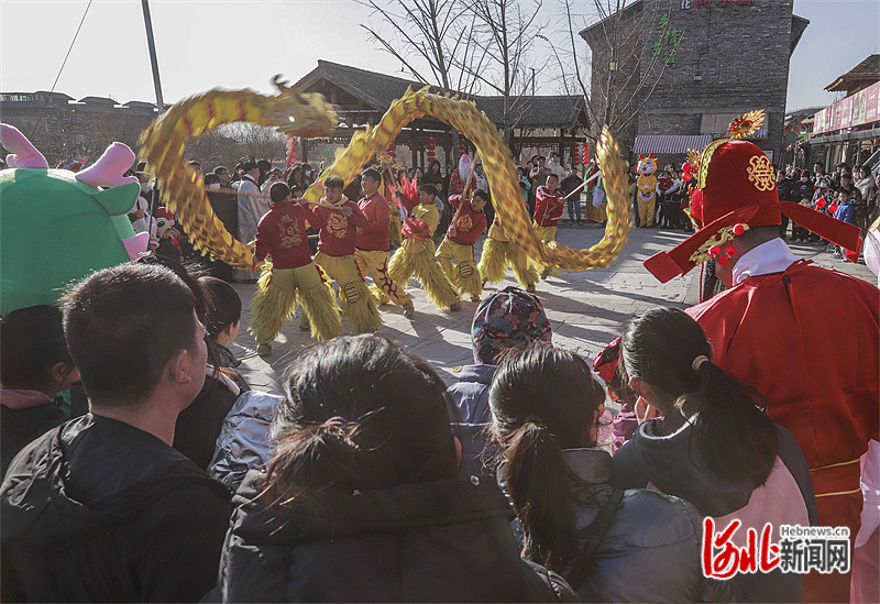 1月25日,游客在河北省遵化市尚禾源景區(qū)廟會觀看舞龍表演