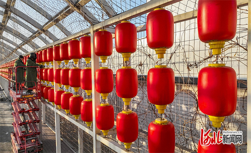 1月18日,工作人員在河北省遵化市團(tuán)瓢莊鎮(zhèn)山里各莊景區(qū)懸掛燈籠。
