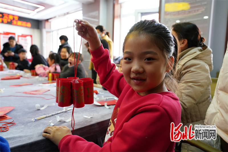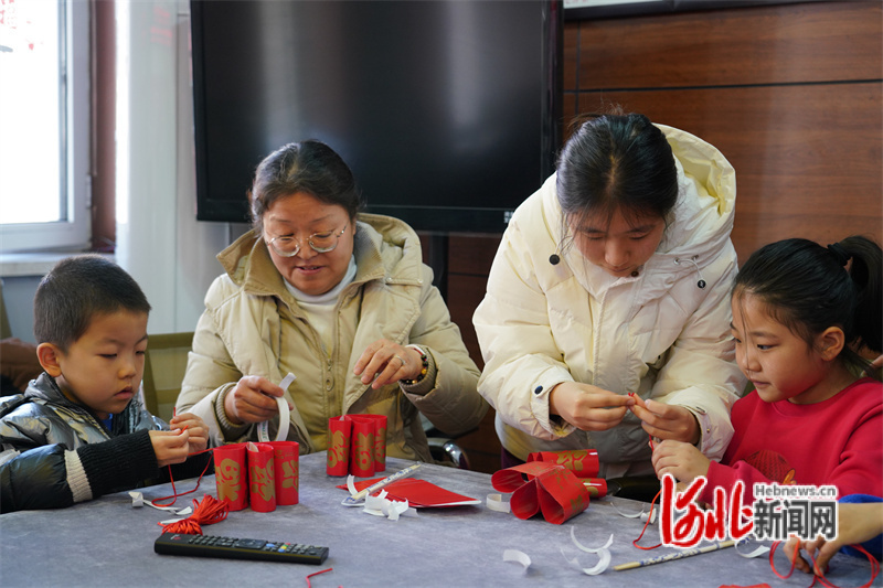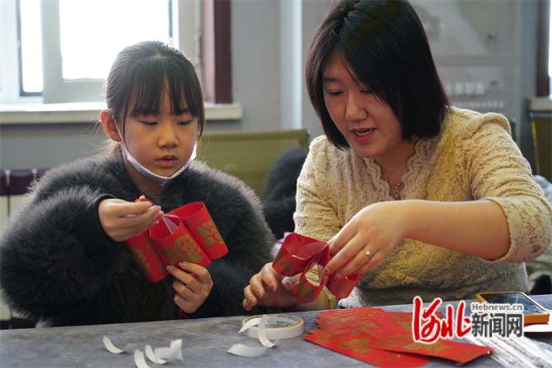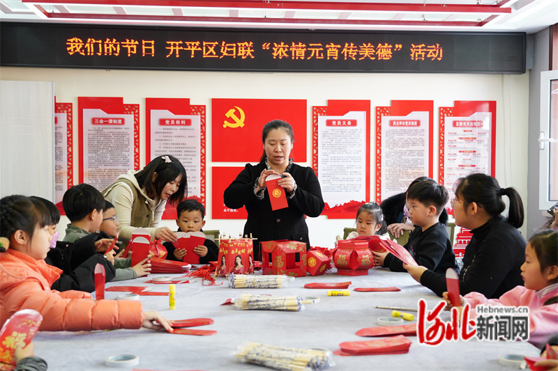 圖為2月23日活動現(xiàn)場,巾幗志愿者教孩子們制作“紅包花燈”。