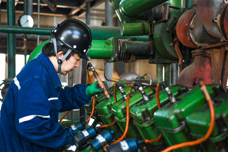 圖為工作人員正在檢測(cè)瓦斯發(fā)電機(jī)組的運(yùn)行狀況。
