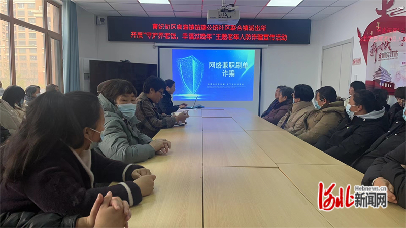 圖為唐山市曹妃甸區(qū)公安局墾區(qū)治安分局唐海鎮(zhèn)派出所民警為社區(qū)居民講解常見的詐騙手段和防騙技術(shù)。通訊員趙賀喜攝