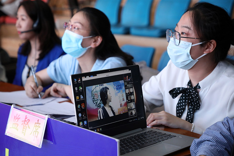 5月26日,在河北省隆堯縣融媒體中心演播大廳,線上參賽選手正在參與答題。