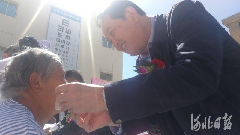 5月31日,“僑界助力脫貧攻堅光明行”活動走進(jìn)張家口。圖為與會領(lǐng)導(dǎo)為接受手術(shù)的患者揭紗。記者劉雅靜攝