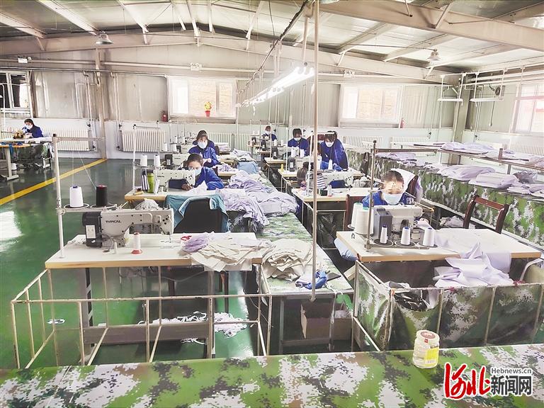 近日,在懷安縣左衛(wèi)鎮(zhèn)北高家窯村扶貧車間內(nèi),工人們正在加工服裝。通訊員岳春蘭攝