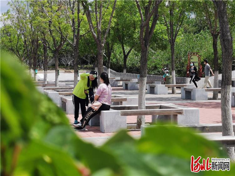圖為5月23日上午,市民在景觀長廊前欣賞園林小品。