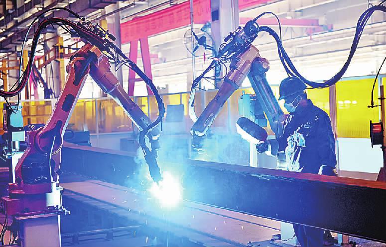 6月13日,在張家口市宣化經(jīng)濟(jì)開發(fā)區(qū)一家專用車制造企業(yè)生產(chǎn)線上,工人在焊接泵車機(jī)械臂。