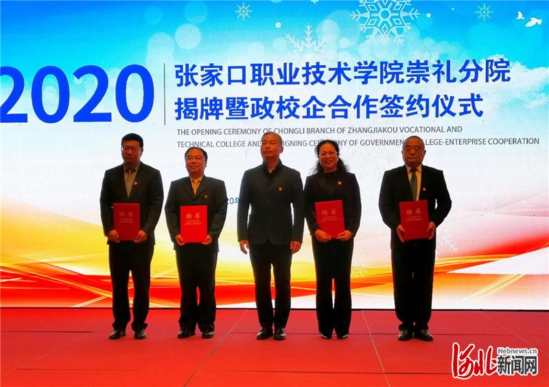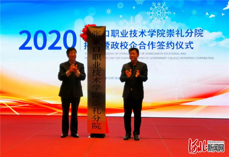圖為張家口職業(yè)技術(shù)學(xué)院黨委書記馮印濤(左)與崇禮區(qū)區(qū)長趙贊(右)共同為崇禮分院揭牌。河北日報(bào)記者王雪威攝