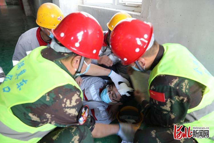 5月8日,河北省張家口市橋東區(qū)防震救援人員在演練現(xiàn)場(chǎng)包扎傷員。