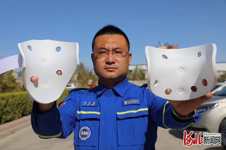 5月8日,藍(lán)天救援隊(duì)隊(duì)員展示救援護(hù)具頸托。