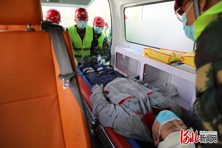 5月8日,河北省張家口市橋東區(qū)防震救援人員在演練傷員轉(zhuǎn)運(yùn)。