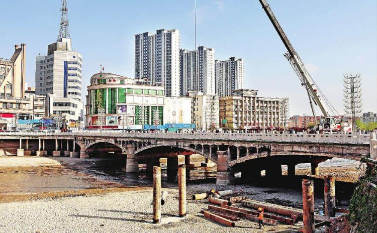 “五一”勞動節(jié)假日,在橫穿市區(qū)清水河的清河橋,施工人員對經(jīng)過專業(yè)橋梁公司檢測存在安全隱患的清河橋,進(jìn)行拆除重建前的人工便橋搭建施工作業(yè),預(yù)計(jì)2021年底前新清河橋竣工通車。 武殿森攝影報(bào)道