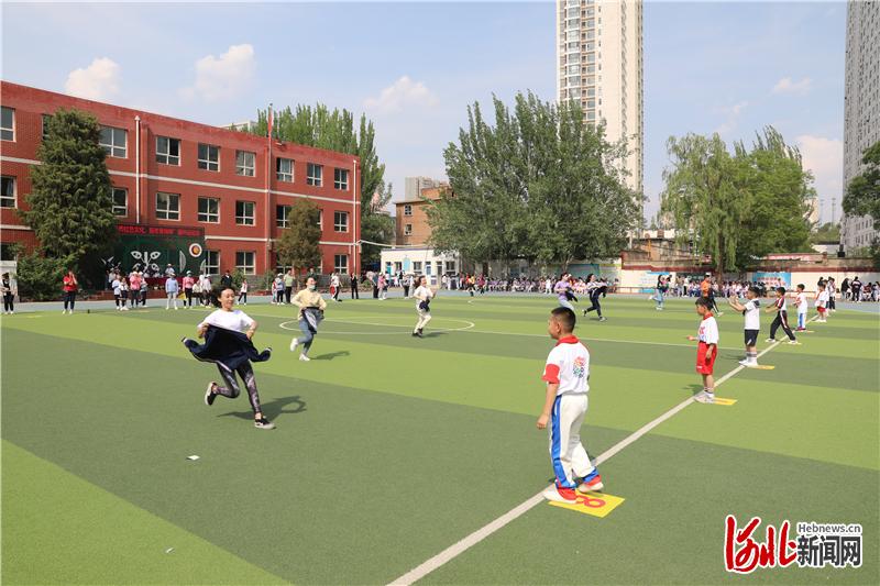 圖為5月20日,河北省張家口市橋東區(qū)工人村小學(xué)趣味運(yùn)動(dòng)會(huì)上,同學(xué)們在游戲“勇闖封鎖線”中競技。