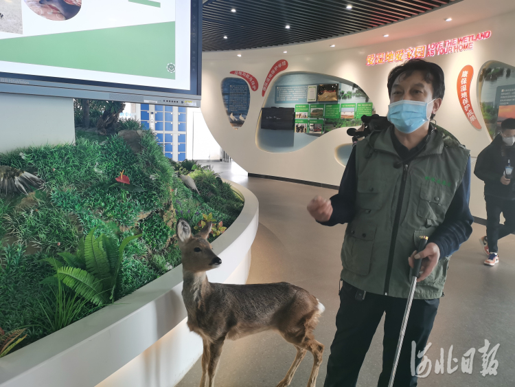 在康巴諾爾濕地公園宣教中心,麻喜榮介紹遺鷗保護和救助狀況時,小狍子與其形影不離。  河北日報記者貢憲云攝