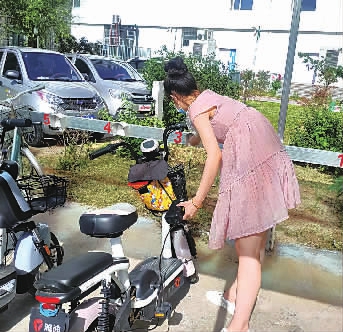 7月12日上午,水岸麗城小區(qū)居民劉女士先在充電裝置前刷了卡,隨后按下了3號鍵,在對應的3號插座插電即開始給電動自行車充電,整個操作過程不超過10秒,頗有些“高科技”的味道!斑@充電車棚確實很方便,解決了之前推車上樓或‘飛線’的安全隱患!眲⑴空f。