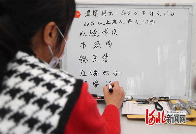 1月9日,工作人員在河北省張家口市懷來縣東八里鄉(xiāng)東八里村幸福食堂小黑板上寫食譜。