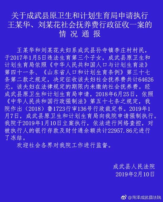 日前,山東省成武縣法院發(fā)布了一則情況通報。通報指出,該縣農(nóng)民王某華和劉某花夫婦違法生育第三個子女,成武縣原衛(wèi)計局依法決定征收該夫婦社會撫養(yǎng)費共計64626元。由于該夫婦在法定期限內(nèi)未繳納社會撫養(yǎng)費,成武縣原衛(wèi)計局申請強制執(zhí)行,縣法院于今年1月10日立案執(zhí)行,對被執(zhí)行人的銀行存款及財付通余額共計22957. 86元進行了凍結(jié)。