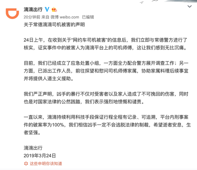 據(jù)鼎城警事微博通報,2019年3月24日凌晨,常德市江南城區(qū)發(fā)生一起命案,一名網(wǎng)約車司機被害身亡。經(jīng)警方核實,事件中的被害人為滴滴平臺上的司機師傅。事發(fā)時,坐在后排的楊某淇乘司機陳某不備,朝陳某連捅數(shù)刀,致陳某死亡。據(jù)楊某淇供述,其因悲觀厭世早有輕生念頭,當(dāng)晚因精神崩潰無故將司機陳某殺害。