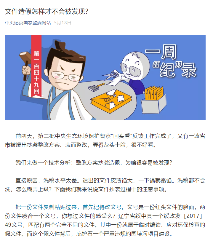 近日,中央紀(jì)委國(guó)家監(jiān)委在其官方微信公眾號(hào)上發(fā)的兩篇文章都很實(shí)在。此前推出的文章《文件造假怎樣才不會(huì)被發(fā)現(xiàn)》一文,讓網(wǎng)友大呼過(guò)癮。而在端午節(jié)前夕發(fā)的這篇題為“端午節(jié)怎么玩,才能在紀(jì)委網(wǎng)站露臉”的文章更是“皮上加皮”,文章說(shuō)要幫助那些節(jié)日期間違反中央八項(xiàng)規(guī)定精神的黨員干部及其事跡“揚(yáng)名”。