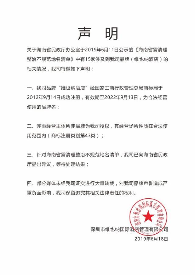 國家六部委《關(guān)于進(jìn)一步清理整治不規(guī)范地名的通知》指出,“工作原則是審慎穩(wěn)妥、依法實(shí)施”!熬S也納酒店”既然是深圳維也納酒店集團(tuán)在原國家工商總局注冊的合法商標(biāo),海南相關(guān)企業(yè)根據(jù)授權(quán)使用這一商標(biāo)與品牌,其權(quán)利應(yīng)當(dāng)?shù)玫接嘘P(guān)部門尊重。
