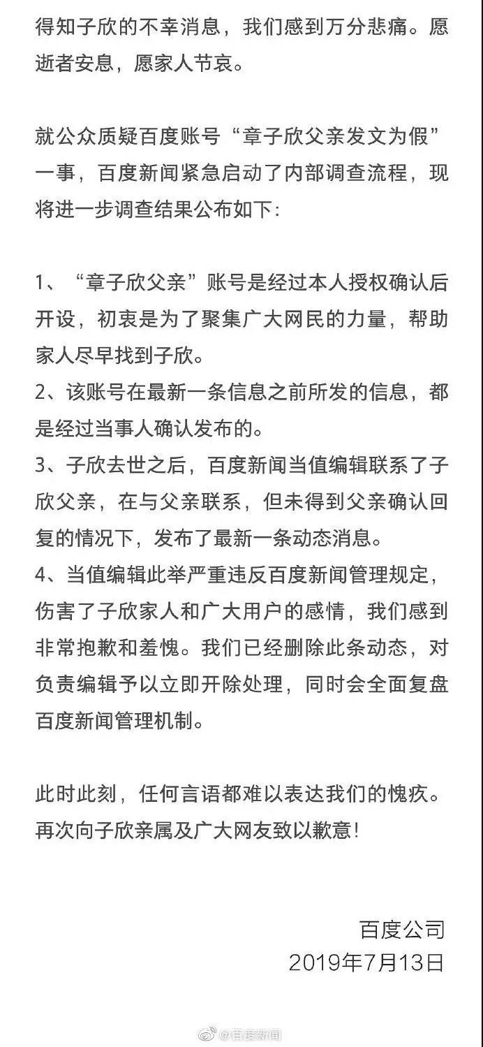孩子都沒(méi)了,還不忘發(fā)帖,語(yǔ)氣還這么“正式”,女童父親因此動(dòng)輒得咎。但家屬否認(rèn)、媒體查證,很快讓“鍋”歸原主。百度官方13日晚再發(fā)聲明,坦承未經(jīng)章父確認(rèn)擅自發(fā)文,并開(kāi)除了責(zé)任編輯。