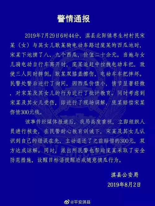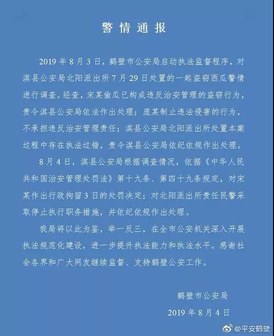 備受關(guān)注的“瓜農(nóng)抓賊倒賠三百”事件,終于有了最終處理結(jié)果。河南省鶴壁市公安局官方微博4日通報(bào)“瓜農(nóng)抓賊倒賠三百”事件,相關(guān)民警被停止職務(wù),偷瓜者行拘3日。