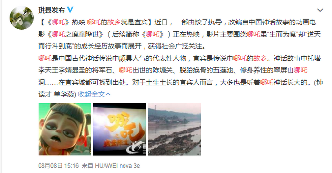 其中,一些地方對“哪吒故里”的爭奪尤其引人注意。8月7日、8日,四川宜賓市政府新聞辦公室官方微博先后發(fā)表了題為《〈哪吒〉熱映,哪吒的故鄉(xiāng)就是宜賓》和題為《哪吒祖廟在宜賓,這事早就有定論》的文章。此外,四川江油、天津陳塘莊、河南西峽縣也紛紛宣稱當地是哪吒的故鄉(xiāng)。