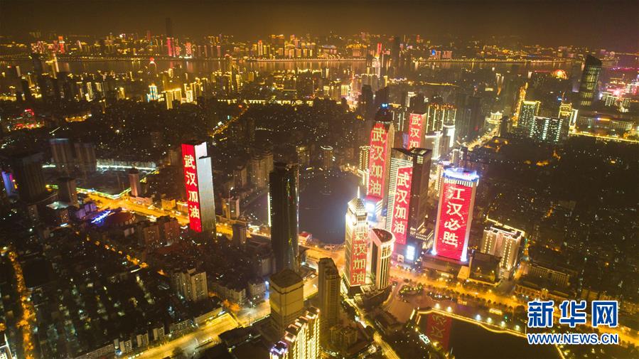 1月31日,武漢市江漢區(qū)西北湖附近高層建筑外墻打出“武漢加油”等字樣(無(wú)人機(jī)照片)。新華社記者 肖藝九 攝