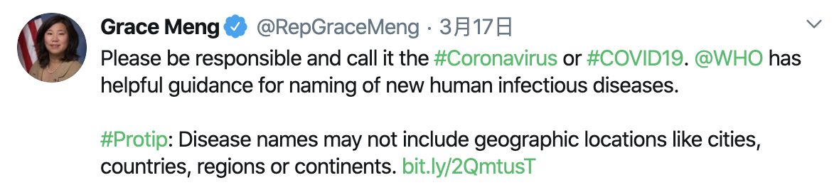 紐約州民主黨議員孟昭文希望政界人士負(fù)起責(zé)任,不給新冠病毒貼標(biāo)簽。她說:“世衛(wèi)組織對傳染病的命名有指導(dǎo)規(guī)則,不能包括城市、國家、地區(qū)或大洲等地理位置。”