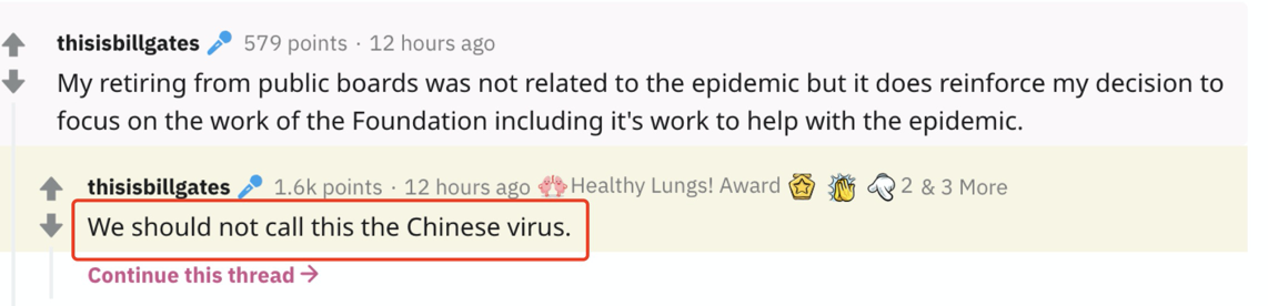 比爾·蓋茨在社交網(wǎng)站上回答網(wǎng)民提問時指出,“我們不應(yīng)該叫它中國病毒。”