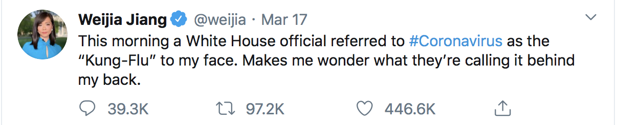 美國哥倫比亞廣播公司(CBS)華裔記者發(fā)推文稱,“17日早上,一名白宮官員當(dāng)著我的面,將新冠病毒稱為‘功夫流感’。這令我懷疑,我不在他們面前的時候,他們都在怎么稱呼它。”