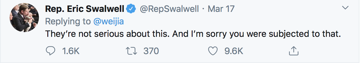 來自加州的聯(lián)邦眾議員埃里克·史沃威爾回復(fù)道,“他們不是認(rèn)真的。我很抱歉你受到這樣的待遇。這是慣常的種族主義。”