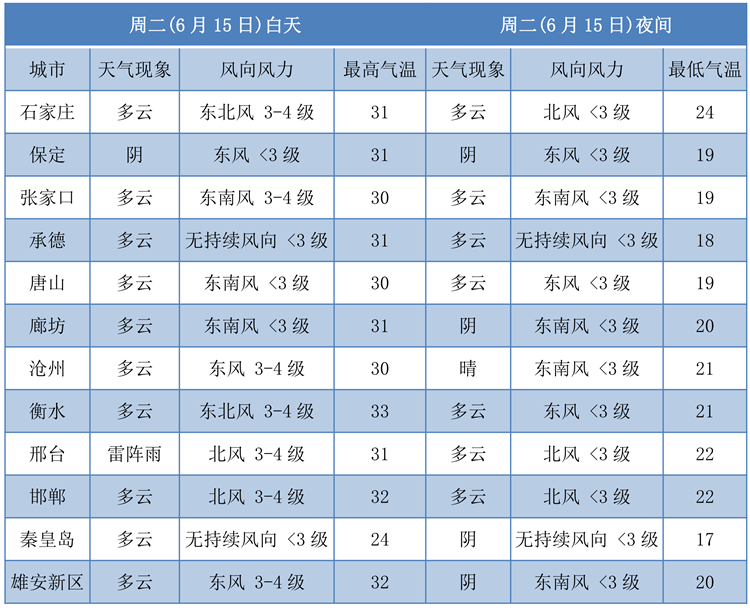 6月15白天,承德南部和保定、石家莊、邢臺(tái)、邯鄲四個(gè)地區(qū)的西部多云間陰有陣雨或雷陣雨,其他地區(qū)多云。