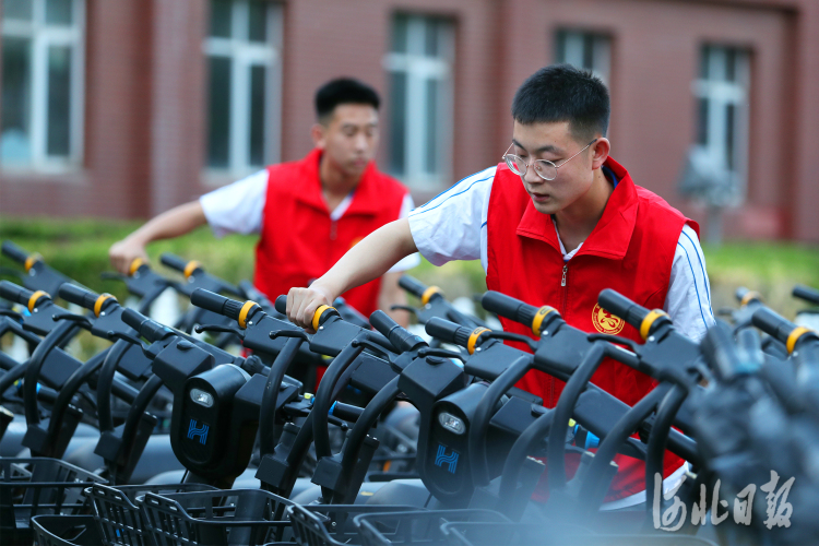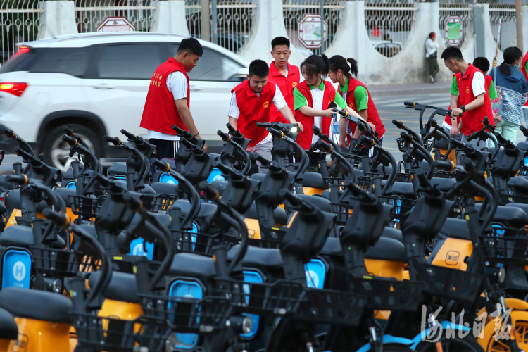 2021年6月20日19時(shí),河北省張家口市職教中心的學(xué)生志愿者們來(lái)到校園周邊的共享電單車停放點(diǎn)位將車輛擺放整齊。