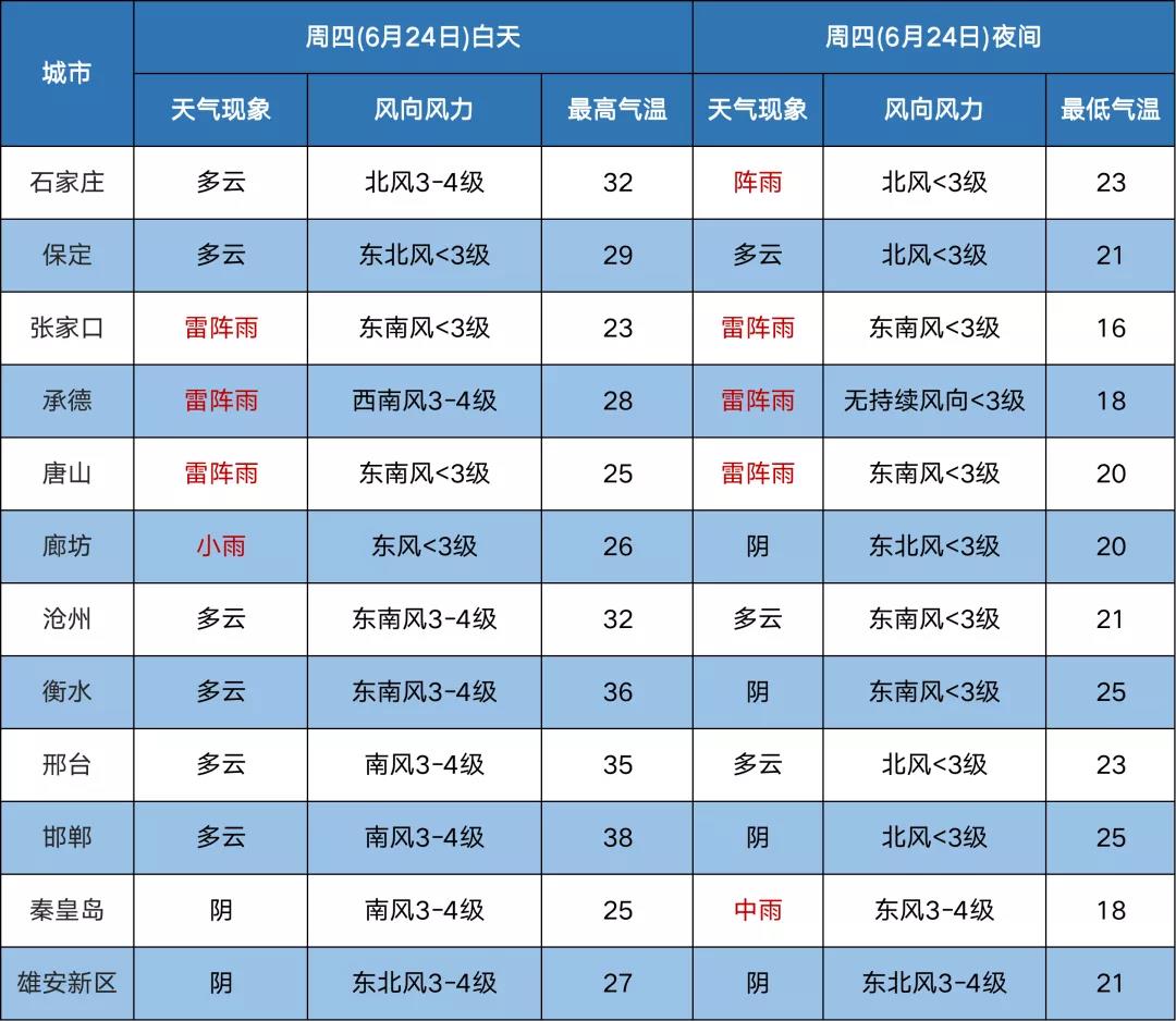 6白23日白天,張家口、承德中西部、保定北部、廊坊北部、石家莊北部晴轉(zhuǎn)陰有雷陣雨或陣雨,其他地區(qū)多云間晴。