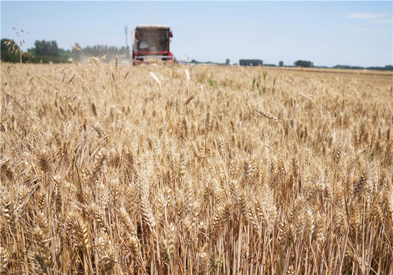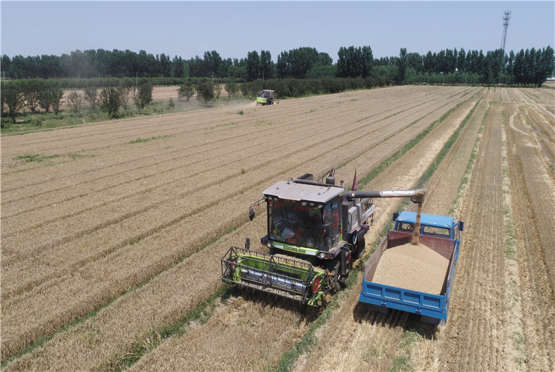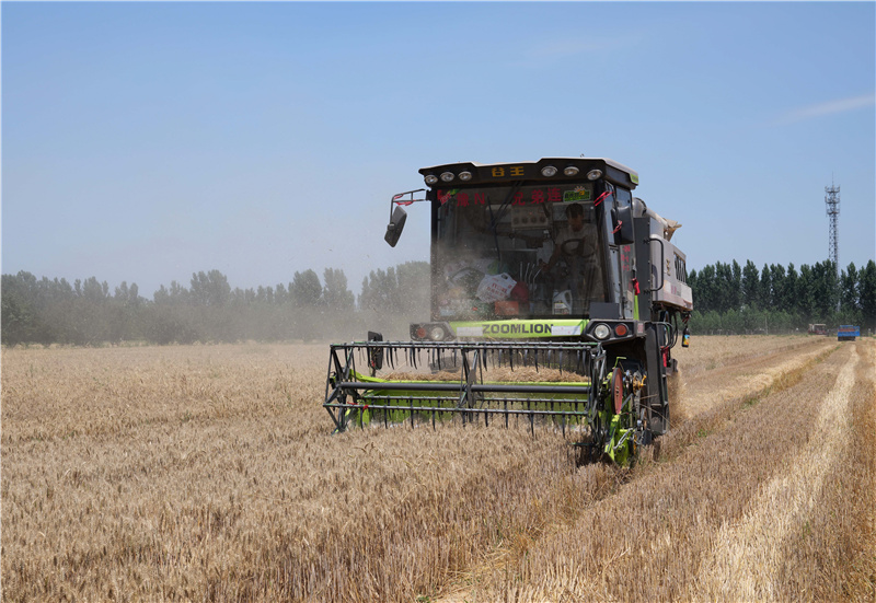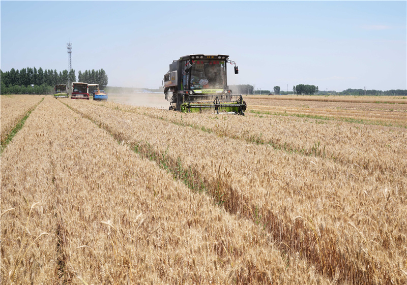 6月22日,聯(lián)合收割機(jī)在唐山市灤南縣長凝鎮(zhèn)方泡村田間收割小麥。