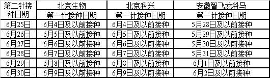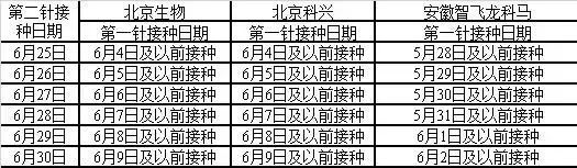6月30日以后根據(jù)國家和省統(tǒng)一部署,將重點開展其他人群的接種,不再組織集中接種第二劑次新冠疫苗。到6月30日我市每天需接種近20萬人,為避免人員累積,造成接種擁擠,第一劑次接種北京生物、北京生物(長春灌裝)、科興中維疫苗滿21天、接種安徽智飛龍科馬疫苗滿28天的居民,按照以下《接種時間對照表》盡快接種第二劑次。