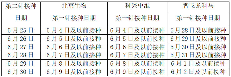 自6月10日-30日期間,在全市范圍內(nèi)集中開展新冠病毒疫苗第二劑次接種活動,此次活動已接近尾聲。7月1日起,根據(jù)國家和省統(tǒng)一安排,將不再組織集中接種第二劑次新冠疫苗。請接種第一劑次滅活新冠疫苗滿21天和接種第一劑次重組新冠疫苗滿28天的市民朋友們,盡快到就近接種點接種第二劑次新冠疫苗。如果您還不清楚自己接種第二劑次疫苗的時間,請參照下表作出安排。
