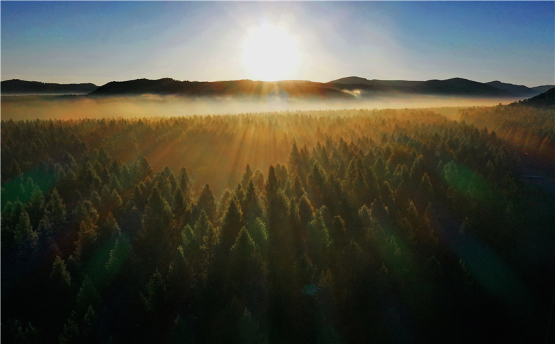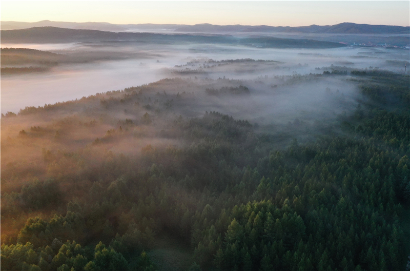 6月27日拍攝的塞罕壩國(guó)家森林公園晨景(無人機(jī)照片)。