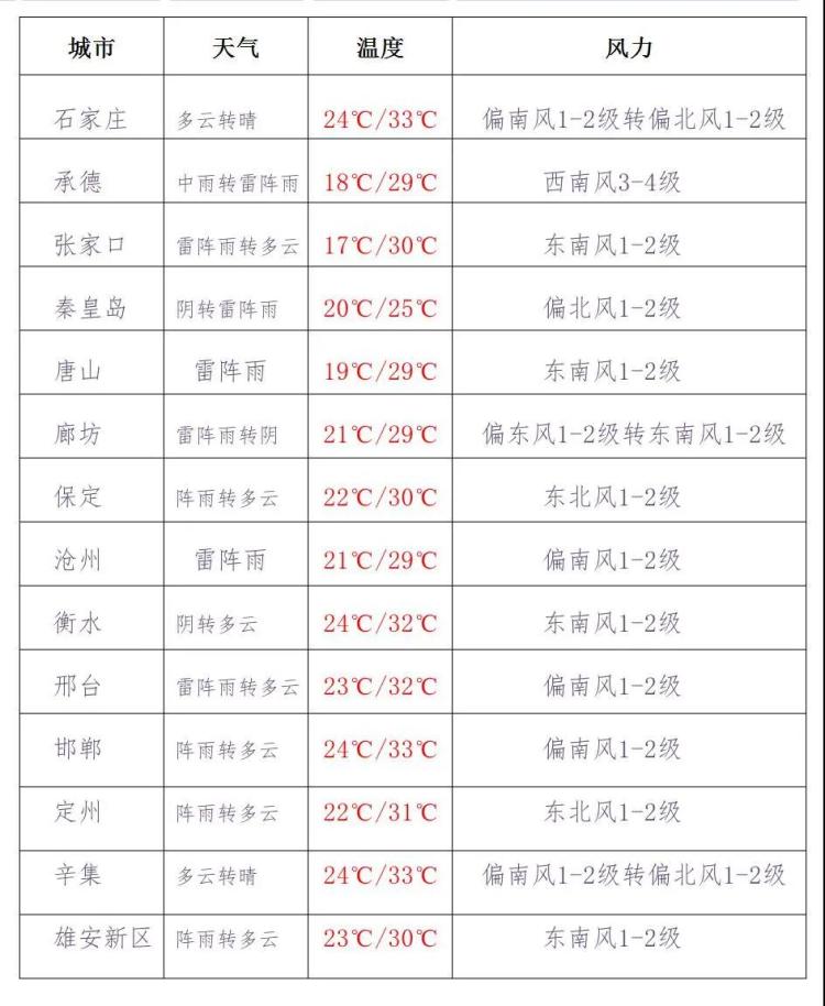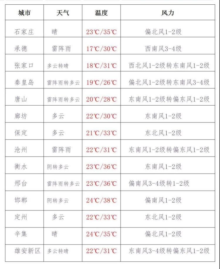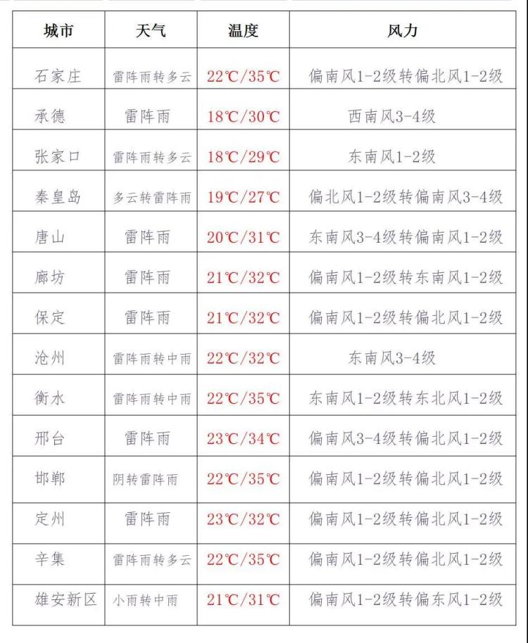 今天下午到夜間,全省多云間陰,大部分地區(qū)有雷陣雨或陣雨,其中承德、唐山、廊坊、保定、石家莊、雄安新區(qū)、滄州局地有中到大雨,個別地點有暴雨,雷雨時局地伴有短時大風(fēng)、短時強(qiáng)降水、冰雹等強(qiáng)對流天氣。