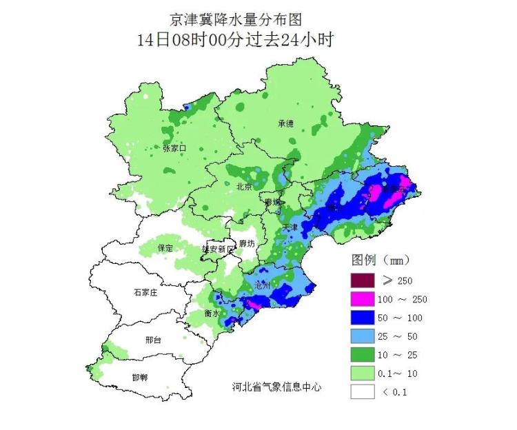 河北省氣象臺(tái)7月14日8時(shí)發(fā)布天氣實(shí)況:13日8時(shí)至14日8時(shí),張家口、承德、唐山、秦皇島、保定中東部、廊坊北部、滄州中東部、衡水中東部、邯鄲西部等地出現(xiàn)降雨天氣,降雨區(qū)平均降水量為22.2毫米,承德南部、唐山、秦皇島、滄州中東部、衡水東北部有286個(gè)站點(diǎn)降水量超過50毫米(暴雨),其中唐山中部、秦皇島中南部、滄州南部有68個(gè)站點(diǎn)超過100毫米(大暴雨),撫寧深河最大為212.1毫米,最大小時(shí)雨強(qiáng)出現(xiàn)在撫寧鴿子塘水庫(kù),為92.2毫米。13日下午青縣、景縣出現(xiàn)8級(jí)短時(shí)大風(fēng)。