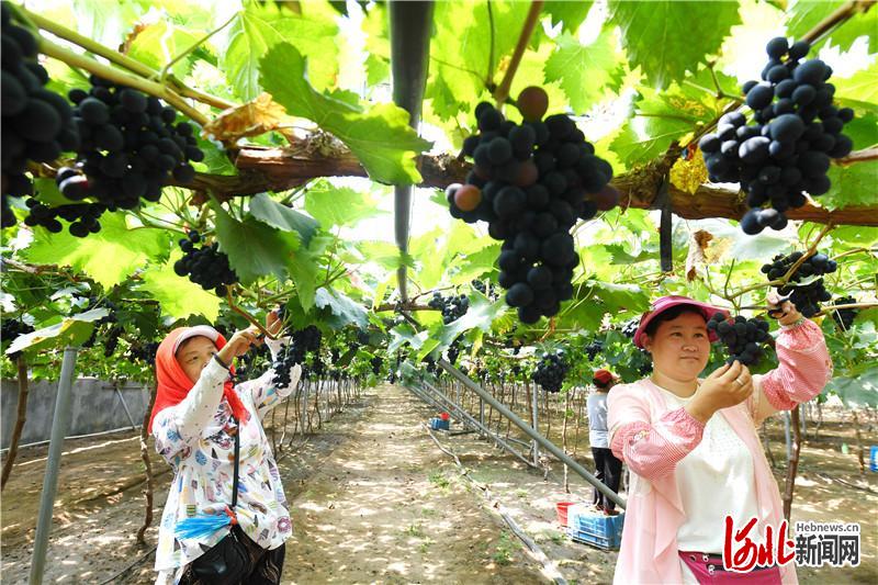 7月14日,懷來縣土木鎮(zhèn)西辛堡村村民朱建平、李淑萍在葡萄園里采摘葡萄。 通訊員孫慧軍攝