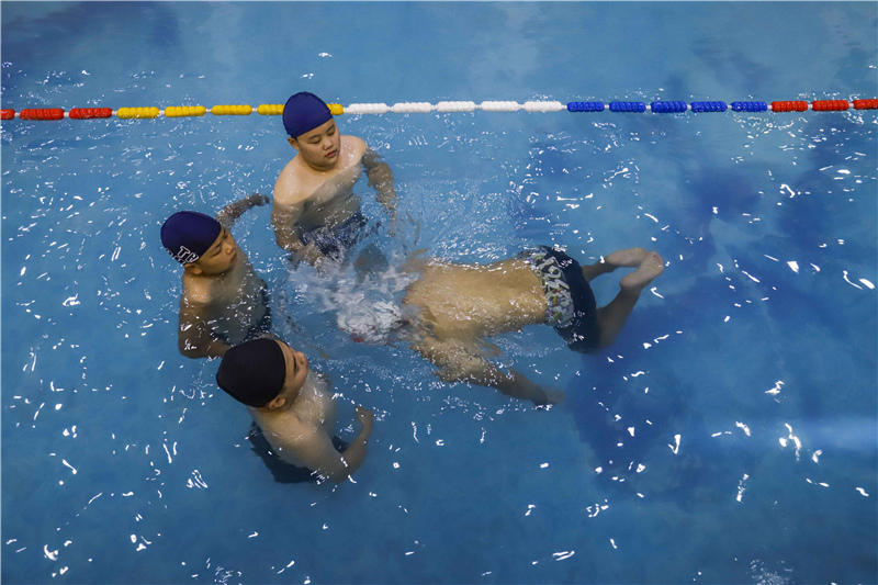 7月20日,教練在河北唐山遵化市一家游泳館為小學生做溺水后的自救動作示范。
