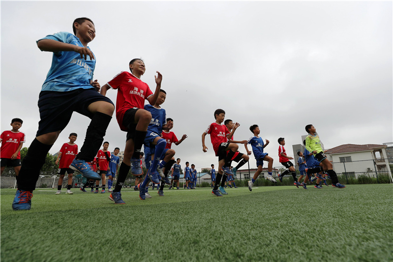 7月20日,小球員在河北唐山海港經(jīng)濟開發(fā)區(qū)一家足球俱樂部的足球場進行訓練。
