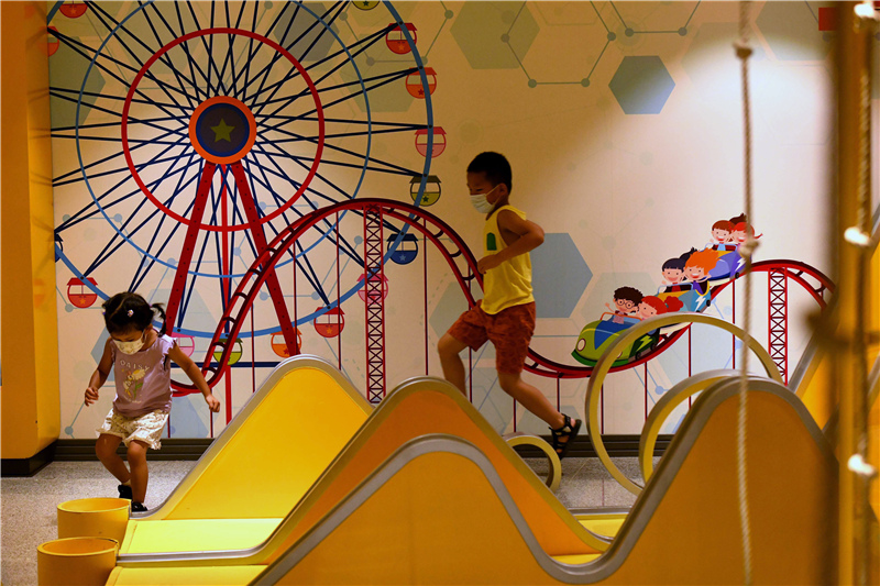 7月20日,小朋友在位于石家莊的河北省科技館參觀體驗。