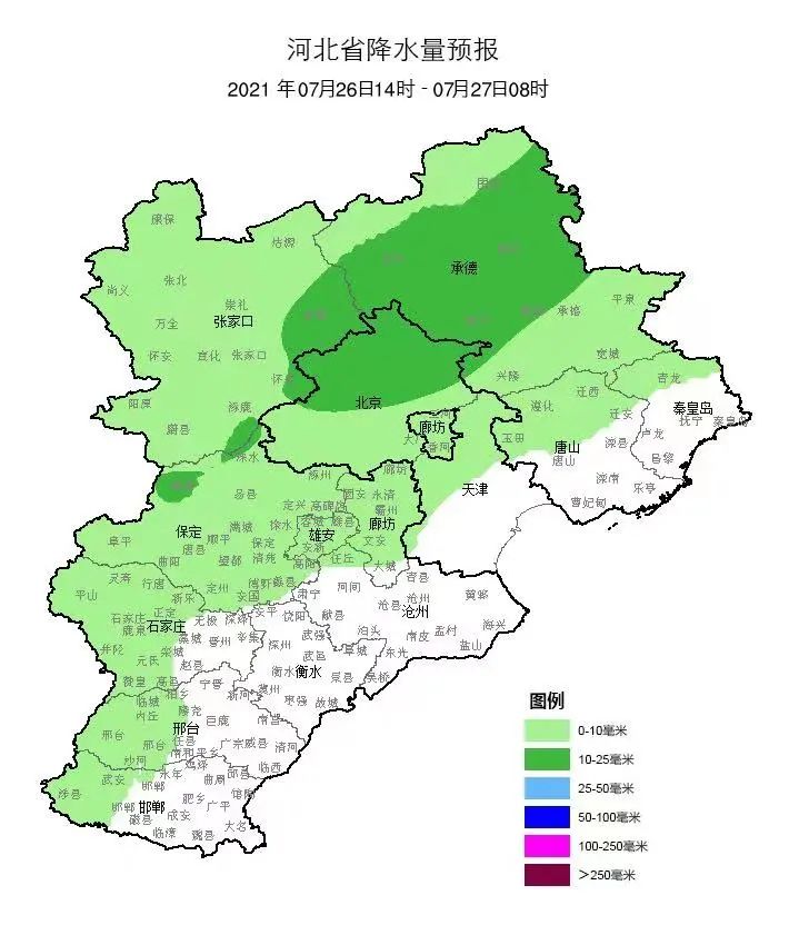 26日下午到夜間,張家口、承德、唐山北部、秦皇島北部、保定、雄安新區(qū)、廊坊和石家莊、邢臺(tái)、邯鄲三個(gè)地區(qū)的西部多云轉(zhuǎn)陰有雷陣雨或陣雨,其中張家口東部、承德西部、保定西北部有中到大雨,局地有暴雨,雷雨時(shí)局地伴有短時(shí)強(qiáng)降水、短時(shí)大風(fēng)等強(qiáng)對(duì)流天氣;其他地區(qū)多云間晴。