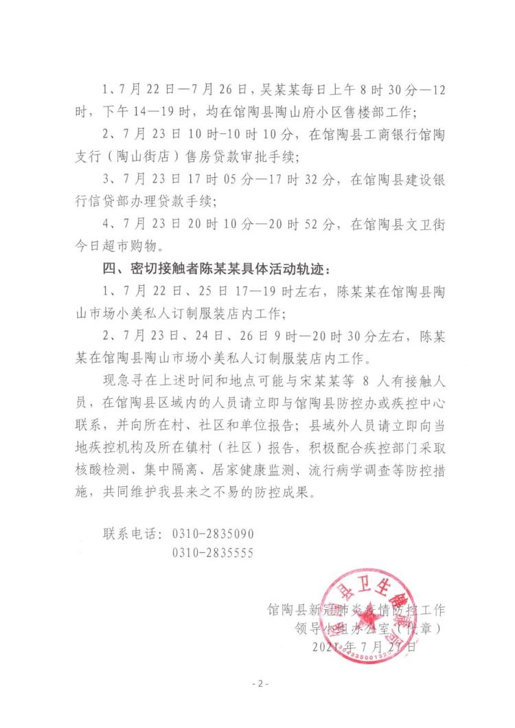 現(xiàn)急尋在上述時(shí)間和地點(diǎn)可能與宋某某等8人有接觸人員,在館陶縣區(qū)域內(nèi)的人員請立即與館陶縣防控辦或疾控中心聯(lián)系,并向所在村、社區(qū)和單位報(bào)告;縣域外人員請立即向當(dāng)?shù)丶部貦C(jī)構(gòu)及所在鎮(zhèn)村(社區(qū))報(bào)告,積極配合疾控部門采取核酸檢測、集中隔離、居家健康監(jiān)測、流行病學(xué)調(diào)查等防控措施,共同維護(hù)我縣來之不易的防控成果。聯(lián)系電話:0310-2835090;0310-2835555。