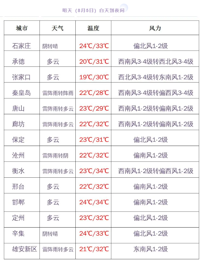 明天(8月5日)白天,全省多云間陰,大部分地區(qū)有雷陣雨或陣雨,其中承德東部、唐山、秦皇島、廊坊、滄州、衡水局地有中到大雨,個(gè)別地點(diǎn)有暴雨,雷雨時(shí)局地伴有短時(shí)大風(fēng)、短時(shí)強(qiáng)降水等強(qiáng)對(duì)流天氣。