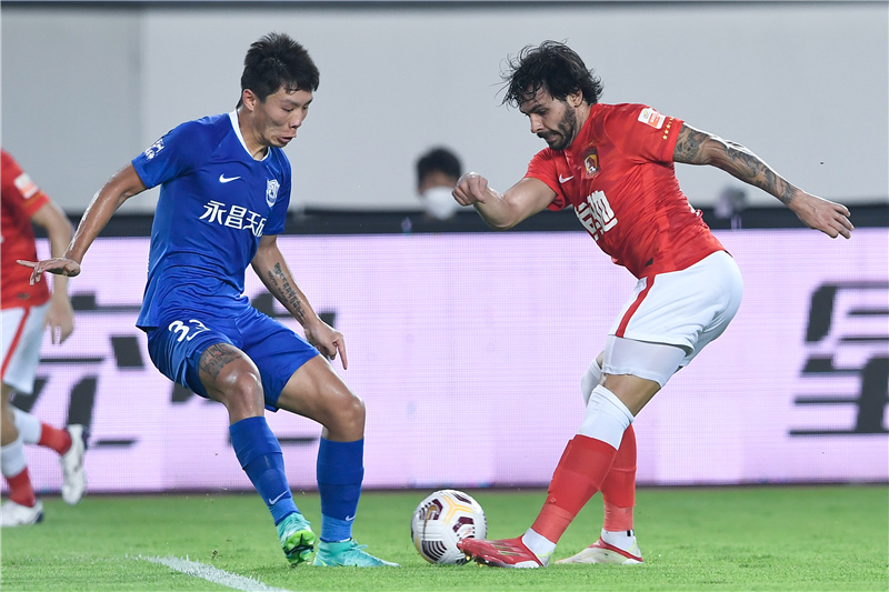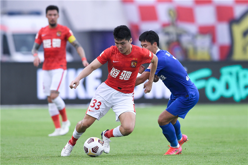 當(dāng)日,在2021賽季中國足球協(xié)會超級聯(lián)賽(廣州賽區(qū))第11輪比賽中,廣州隊以5比2戰(zhàn)勝滄州雄獅隊。新華社發(fā)