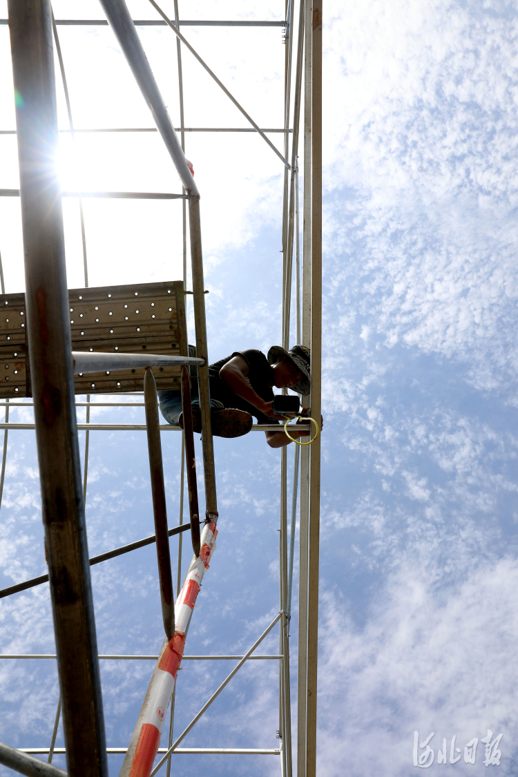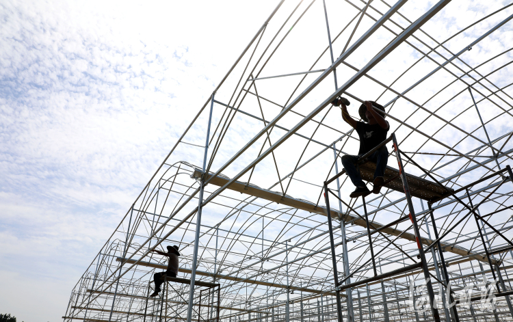 2021年8月4日,在河北省石家莊市平山縣兩河鄉(xiāng),工人正在進行平山縣育苗中心項目建設。當下正值三伏天中伏,在位于河北省石家莊市平山縣兩河鄉(xiāng)的平山縣育苗中心項目工地上,工人冒著酷暑堅持工作,保證項目有序推進。