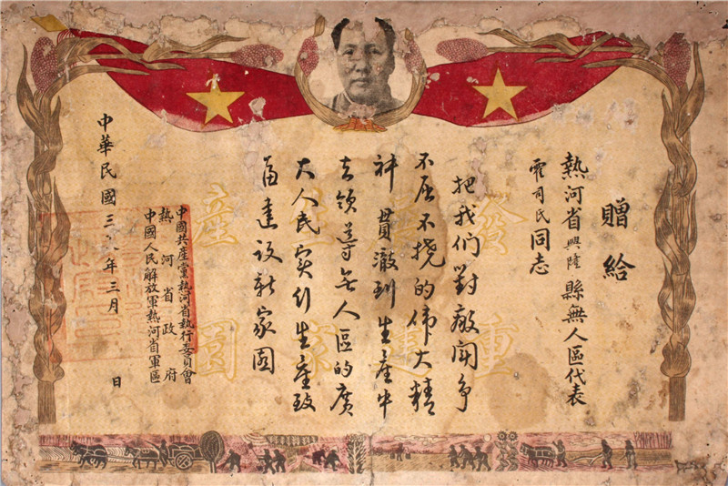 贈(zèng)給熱河省興隆縣無人區(qū)代表霍司氏同志的獎(jiǎng)狀。